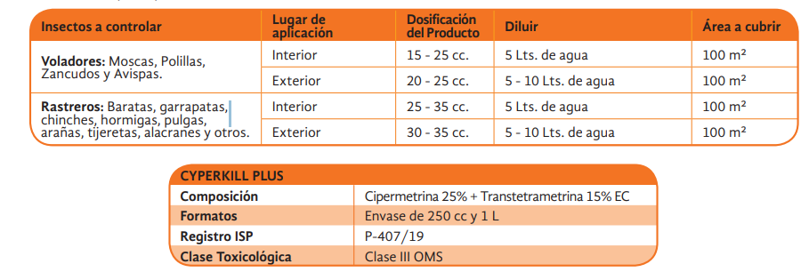 Cyperkill Plus es una potente asociación de dos activos, Transtetrametrina; una eficaz molécula de la familia de los piretroides que se caracteriza por tener uno de los más altos efectos de derribo, desalojo y de volteo, y Cipermetrina; un ingrediente activo de amplio espectro que destaca por su prolongado efecto residual. Cyperkill Plus está formulado especialmente para ser usado en todos aquellos lugares en los que se requiera un tratamiento de choque en el que se busque disminuir rápidamente la población de insectos plaga presente en el lugar. Cyperkill Plus formulado con un excipiente especial de origen vegetal, diferente a los solventes tradicionales, que se caracteriza por ser bastante menos irritante y de menor olor que los excipientes tradicionales. Además, este solvente acelera el paso de los ingredientes activos por el exoesqueleto de los insectos, lo que aumenta aún más su velocidad de acción. Cyperkill Plus es un producto ideal para ser incorporado en programas integrados de control de plagas, gracias a una alta efectividad, muy buen perfil toxicológico para mamíferos y aves, y por ser muy amigable con el medio ambiente. Sus amplios registros a nivel mundial permiten su uso en programas de BPA´s, PABCO, HACCP, AIB y otros