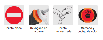 - Marcado y código de color para fácil identificación de medida y punta
