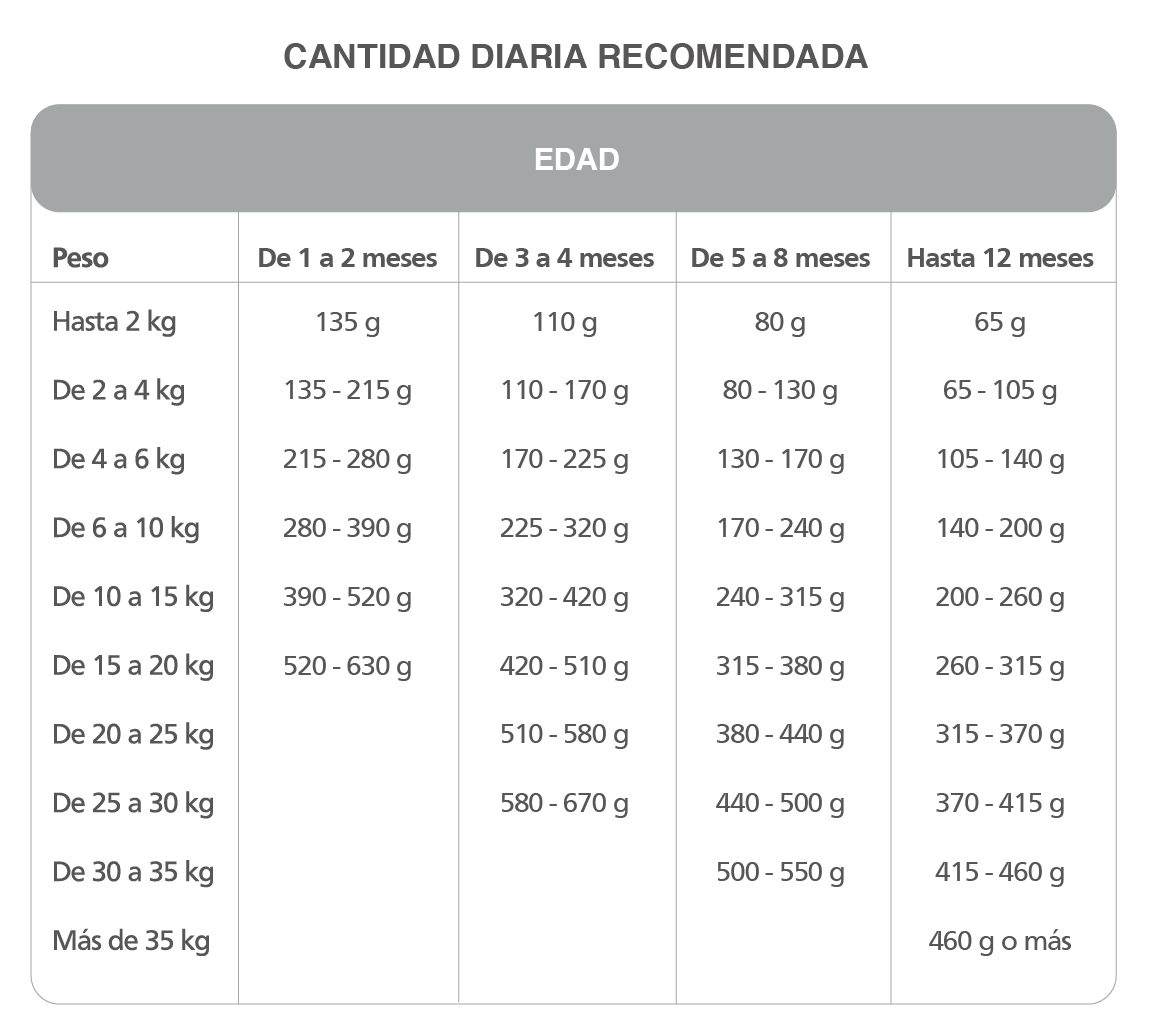 Harina de carne vacuna, harina de pollo, trigo, maíz, gluten de maíz, germen de maíz, arveja, harina de soja, levadura de cerveza, aceite de pollo, carbonato de calcio, sal yodada, cloruro de potasio, pulpa de remolacha (fuente de fructo-oligosacáridos), zeolita, leche en polvo, extracto de yucca schidigera, espinaca deshidratada, hidrolizado proteico de pollo, ácido cítrico, tocoferoles, dipropionato de amonio, ácido propiónico, núcleo vitamínico-mineral: vitaminas A, D3, E, K, B1, B2, B6, B12, ácido fólico, ácido nicotínico, ácido pantoténico, biotina, colina, minerales: zinc, hierro, cobre, yodo, manganeso, selenio.